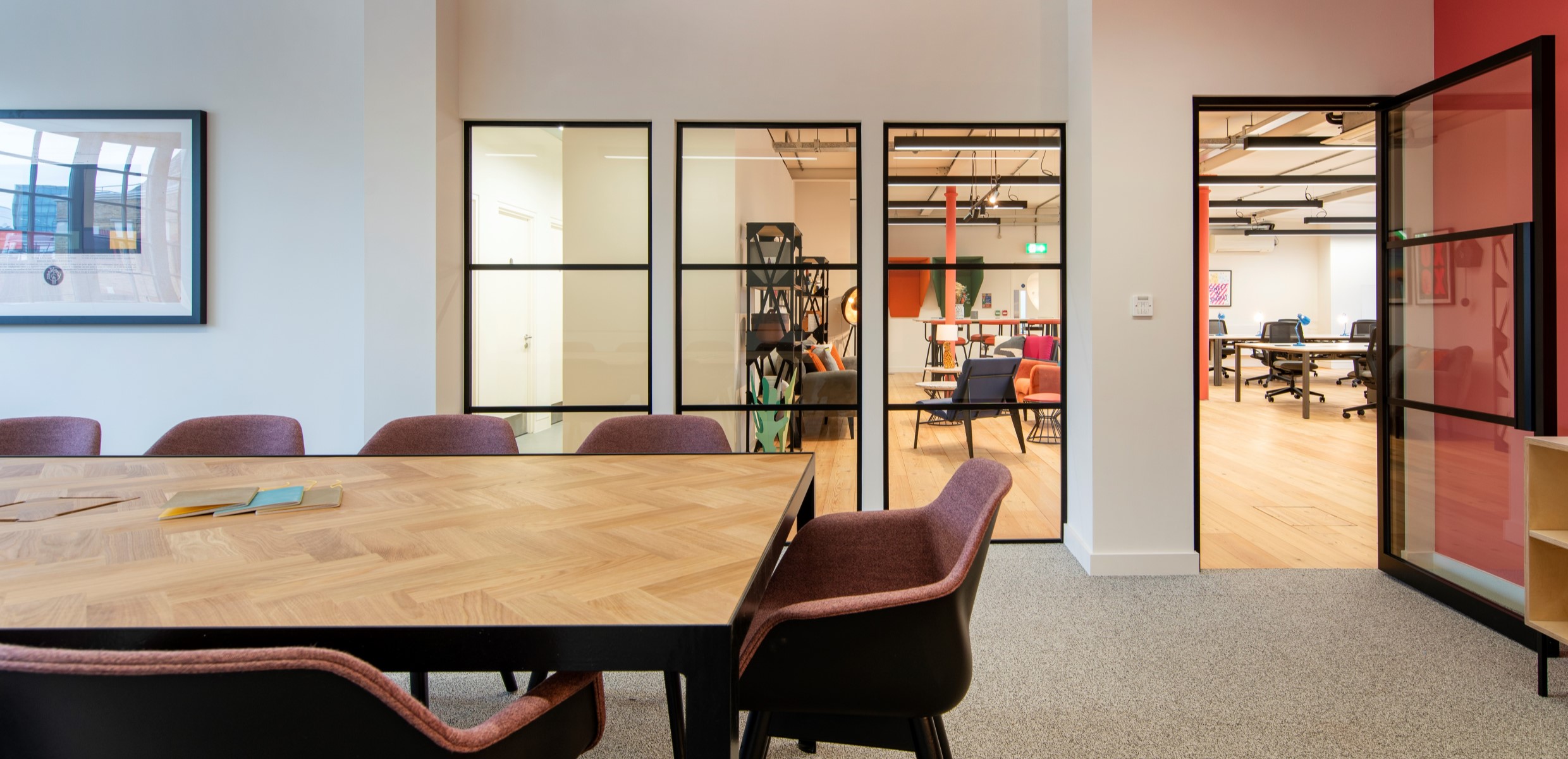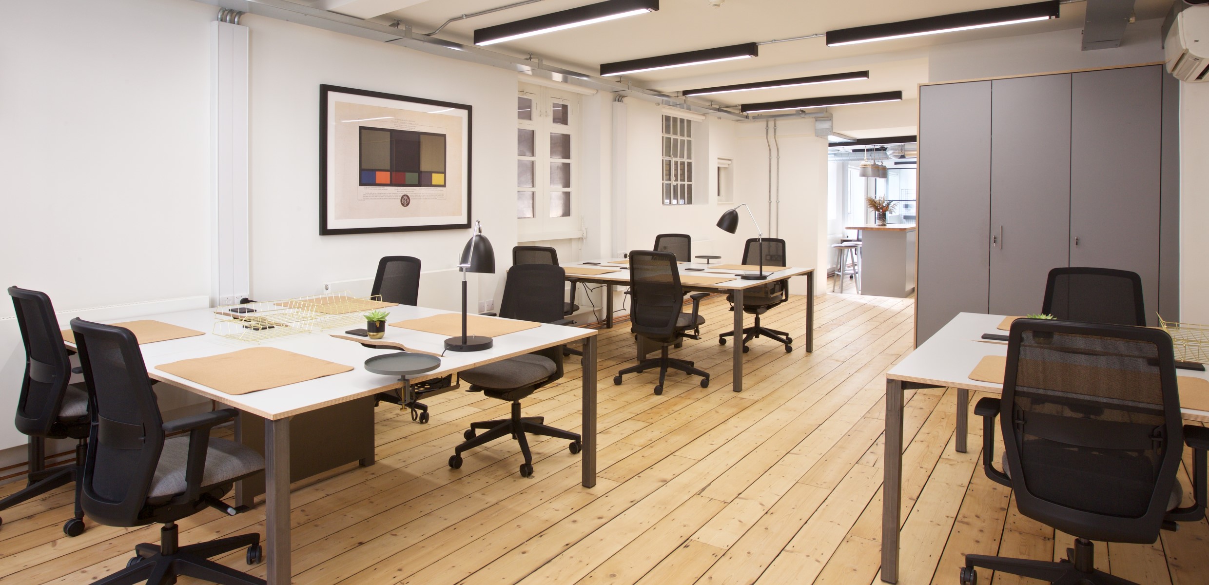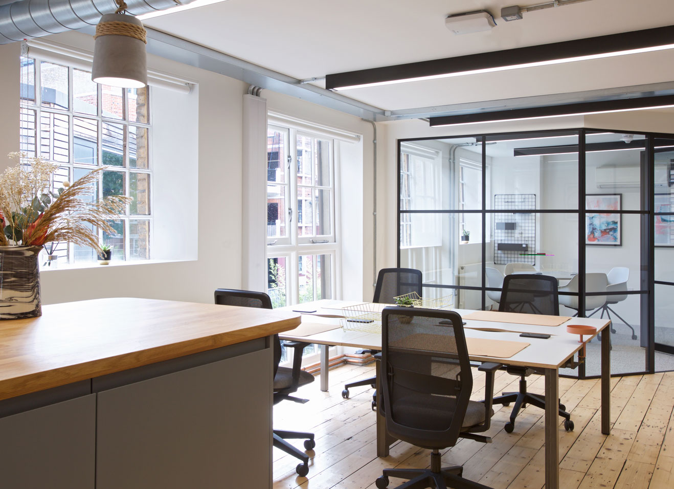 - Exposed concrete ceiling with slimline linear LED suspended lighting system