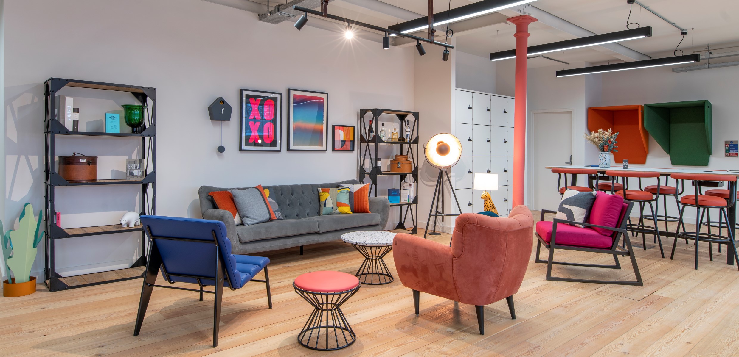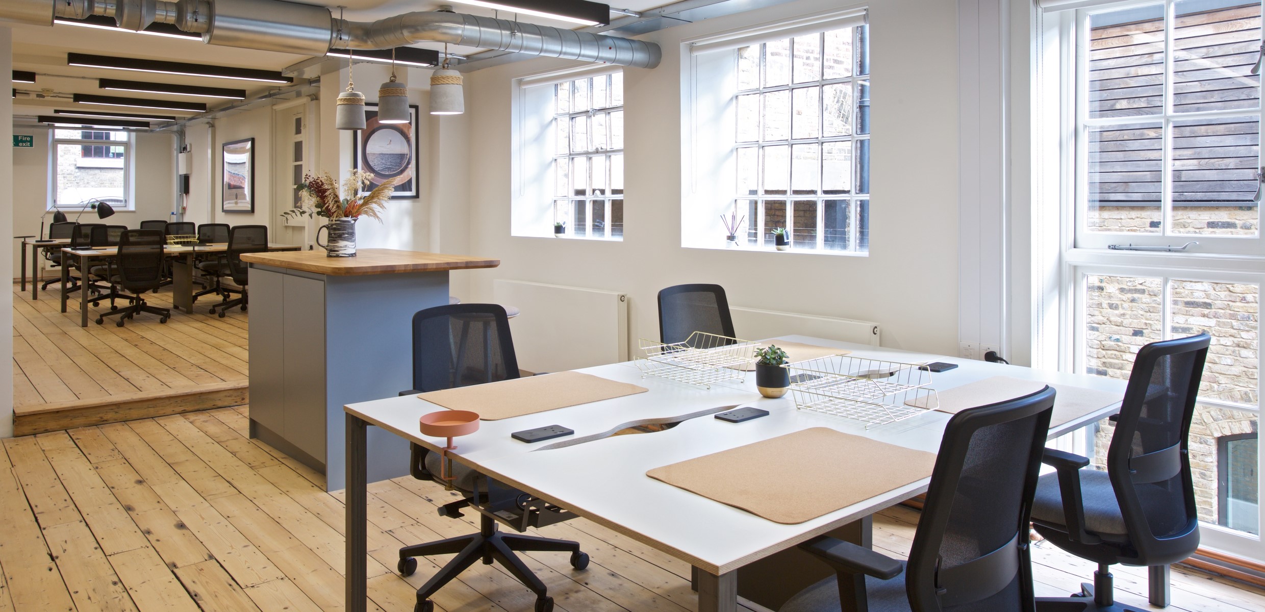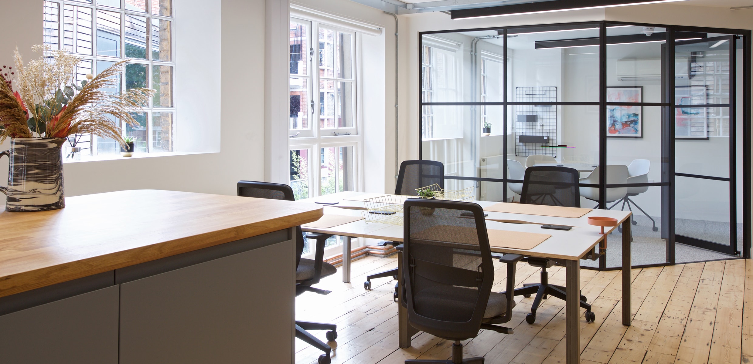 - Exposed concrete ceiling with slimline linear LED suspended lighting system
